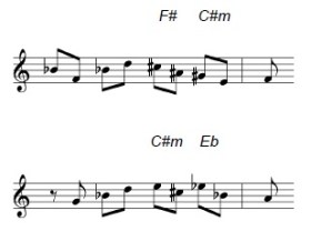 Focusing on these triads in solo lines hits the interesting chord tones over the dominant and allows for strong parallel structures between the II and V chords. The triads can also be made to resolve smoothly into a chord tone on the I chord. Some examples: