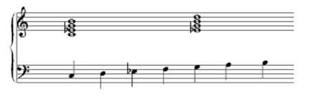 There are two gestures, groups of notes, that succinctly and unambiguously define the sound of a melodic minor scale. They are root, minor 3rd, 5th, major 7th and minor 3rd, 5th, major 7th, 9th. Pianists use these structures often as left-hand voicings (they’re known as “grips”). They are given here in C melodic minor: