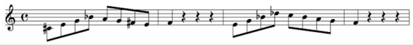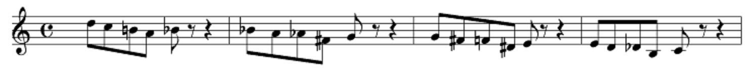 Then there’s this figure, which is very typical of Parker. It’s commonly used in major, but can be adapted to minor. Think of it like this: 5th, scale tone/chromatic up to root, scale tone/ chromatic down to 3rd, then down the major pentatonic (note how it exploits the point in the major scale where scale tones are the same as chromatic approaches). One option then has the line returning to the root (still within the pentatonic scale), as shown: