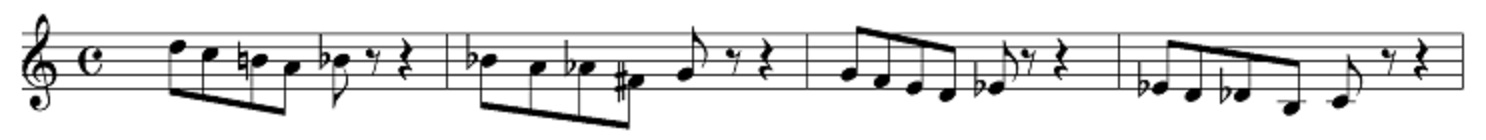 This exercise combines a variation on the downward “dither” from 7th to 5th with a descending triadic cell (5 3 2 1) and finally a descending diminished scale line. As this example demonstrates, there are all sorts of great sounding combinations of these exercises and principles.